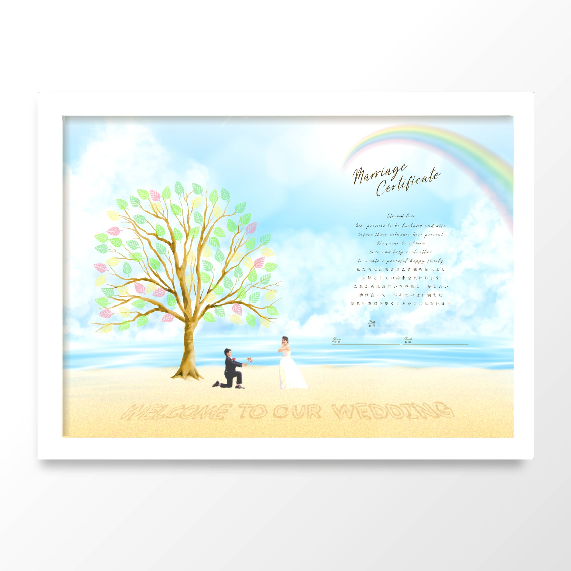 本作品はウエディングツリーと結婚証明書が一体となった作品です。 海辺をモチーフにしたデザインで、海の見える結婚式場や海外ウェディングにピッタリ! 前撮り写真のデータを使用して新郎新婦様をデザインに取り込んだオリジナル制作が人気です。 誓いの言葉もオリジナル文章に変更可能ですので、オリジナルにこだわりたい方にはピッタリ。 この価格でオーダーメイドができるのは当店の最大の強みです。