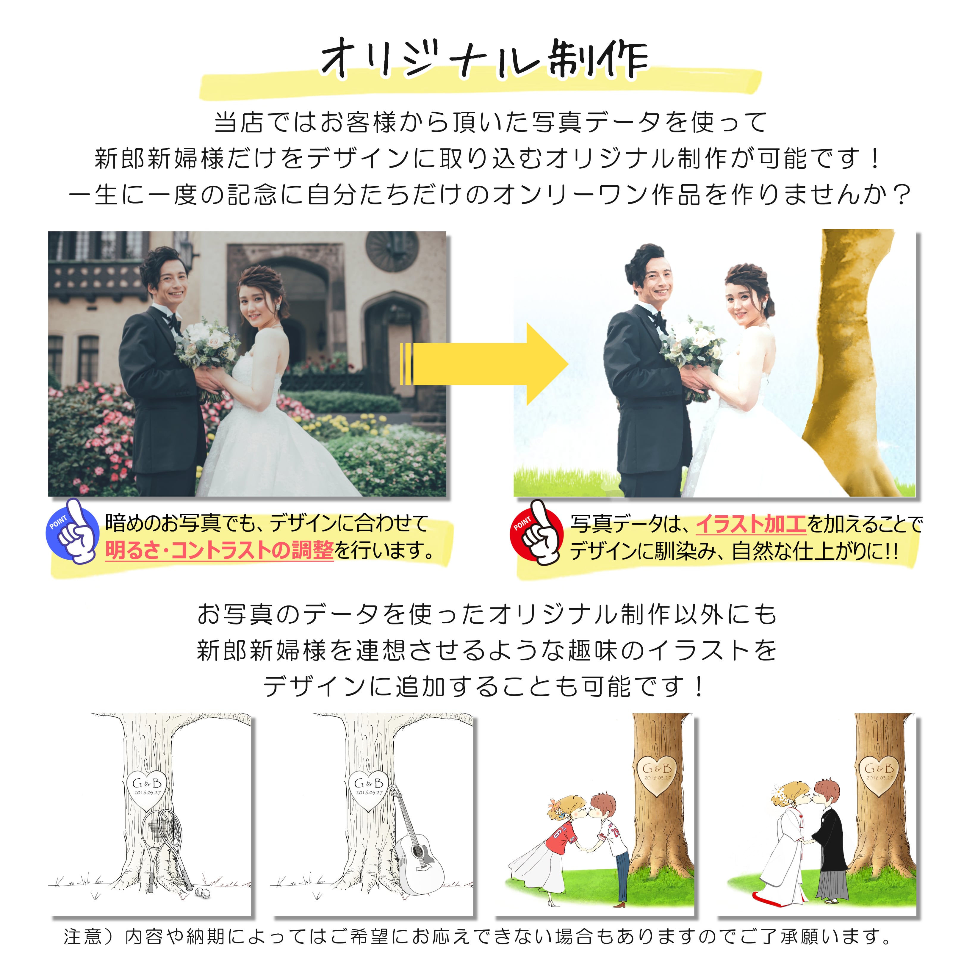 本作品はウエディングツリーと結婚証明書が一体となった作品です。 前撮り写真のデータを使用して新郎新婦様をデザインに取り込んだオリジナル制作が人気です。 誓いの言葉もオリジナル文章に変更可能ですので、オリジナルにこだわりたい方にはピッタリ。 この価格でオーダーメイドができるのは当店の最大の強みです。