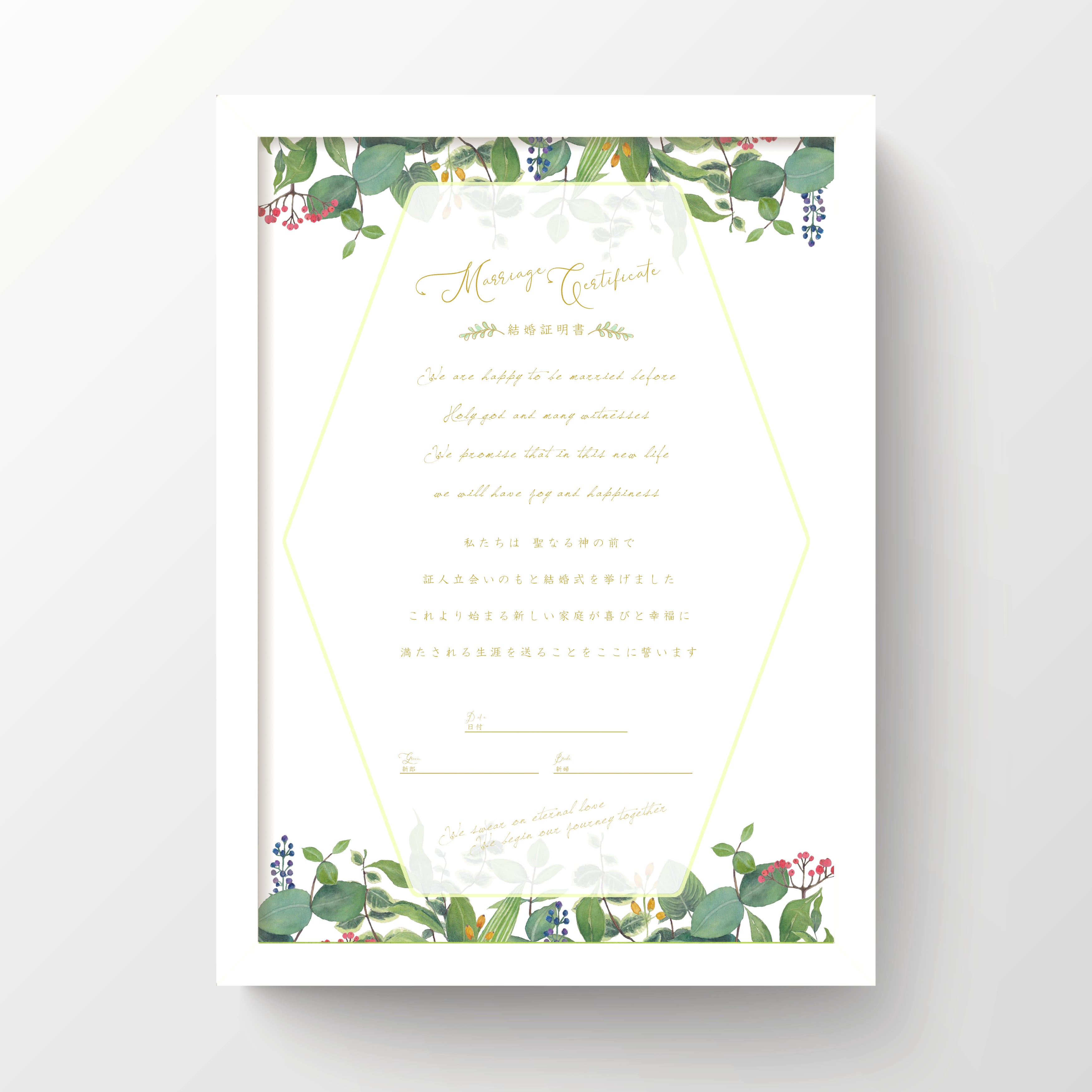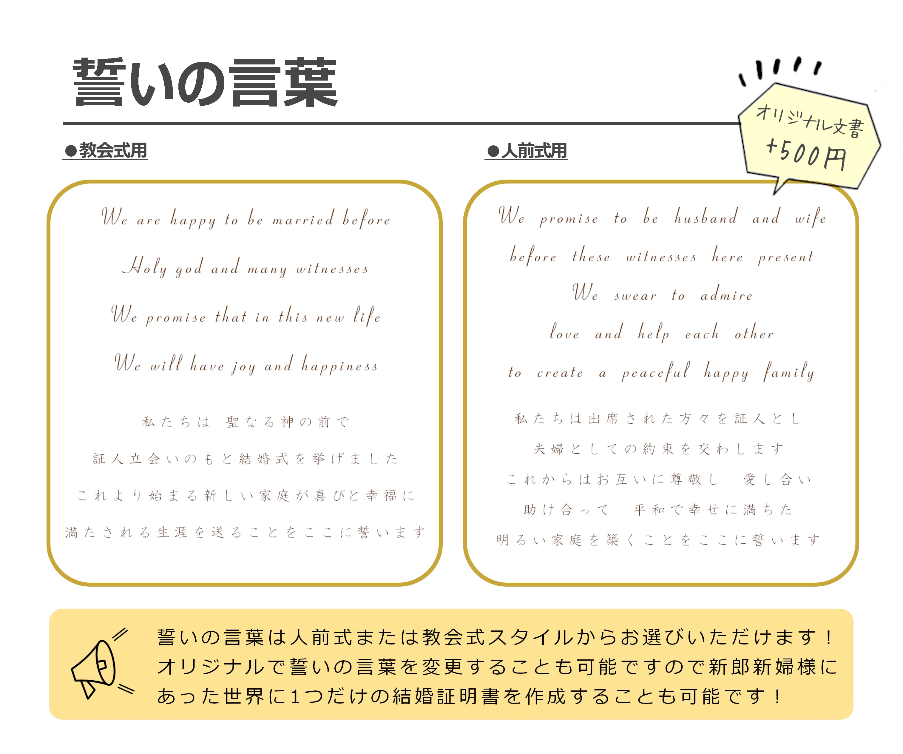 結婚証明とは新郎新婦が結婚を誓う際に、誓いの言葉が綴られた証明書に二人のサインをする ウェディングアイテムです。当店の結婚証明書はオリジナルの文章もOK!新郎新婦ならではの 誓いの言葉にすることでより一層思い出に残るものになります。